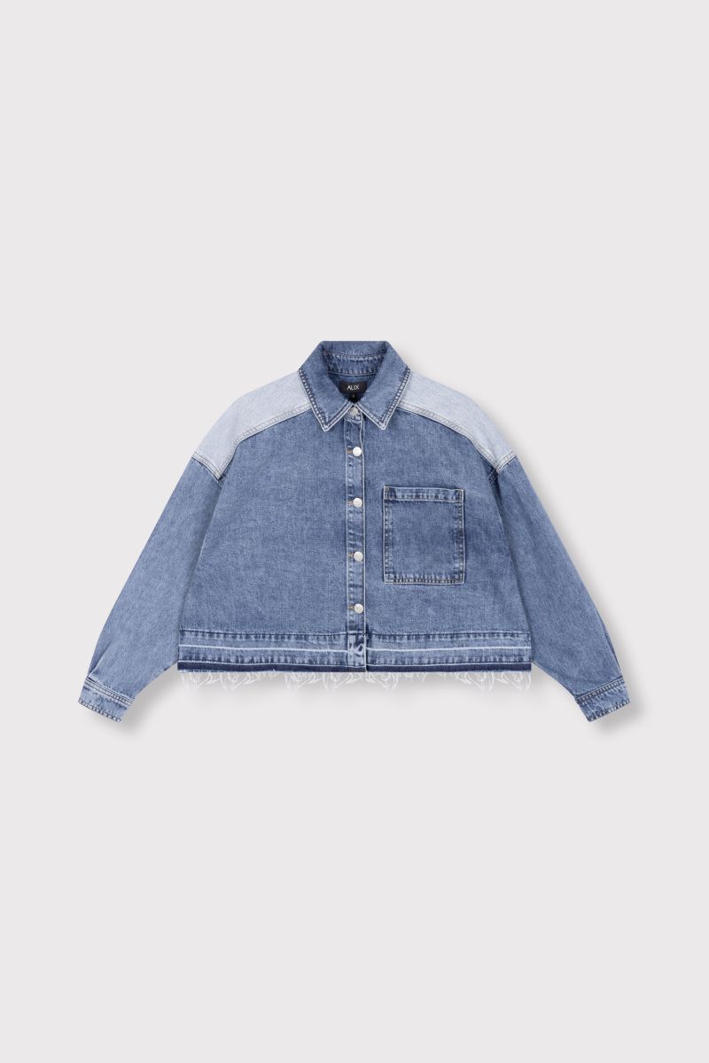 Jeansjacke von ALIX – Cropped Fit * durchgehende Knopfleiste * zweifarbiger Softdenim * offener Saum * Kragen * Labelprint hinetn Farbe: light blue denim Material: 100% Baumwolle Pflege: Maschinenwäsche